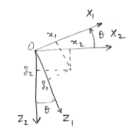 Figure 1.4 shows the rotation from \(X_2Y_2Z_2\) frame to \(X_1Y_1Z_1\) frame. Note that the \(Y_2\) and \(Y_1\) axes are coincident and are pointed out of the plane. The positive sign convention for \(\theta\) follows the right hand rule about the \(Y_2\) (or \(Y_1\)) axis and is thus denoted in the anti-clockwise direction in Figure 1.4. From Figure 1.4 it can be seen that the \(x_2\) and \(z_2\) can be expressed in terms of \(x_1\), \(z_1\) and \(\theta\) as shown in \(\eqref{eq-y2-rotm}\) and \(\eqref{eq-y2-rotm-expanded}\).