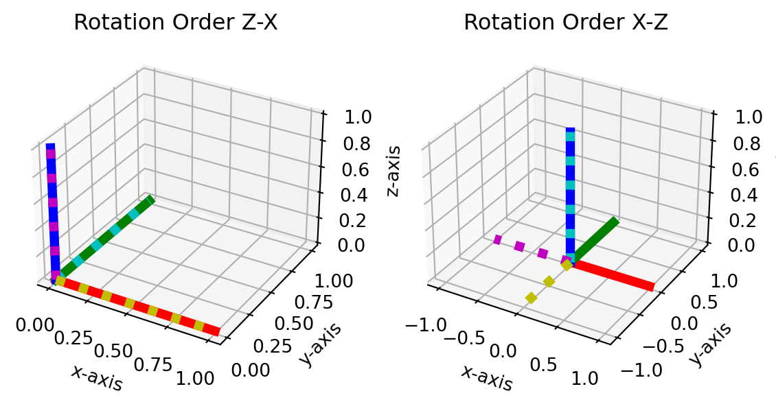 Euler angle representation: The orientation between two coordinate frames is expressed as a sequence of three rotations in a specified order. Unlike translations, rotations are not commutative and thus a specific order needs to be maintained. The non-cummutative property of rotations can be seen from Figure 1.2 where two \(90^\circ\) rotations are applied in two different orders. The first approach applies a \(90^\circ\) rotation about the x-axis followed by a \(90^\circ\) rotation about the new z-axis. The second approach interchanges the rotation order - a \(90^\circ\) rotation about z-axis is applied first and then a \(90^\circ\) rotation is applied about the new x-axis. The orientations of the new coordinate frames are completely different when the order of rotations is swapped. The Python code used to generate the results showns in Figure 1.2 is shown below. Euler angles will be described in detail in Section 1.3.