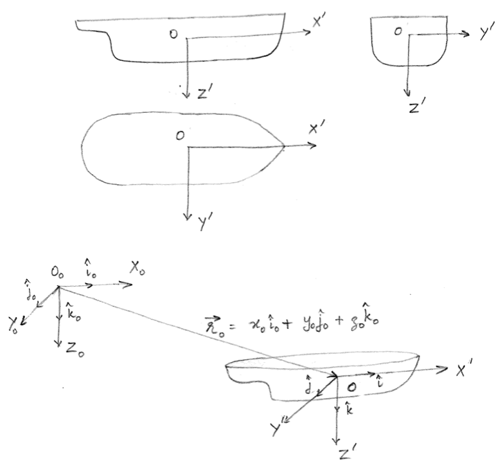 Body Coordinate System (BCS): This is a coordinate system fixed with the vehicle. As the body undergoes motion the BCS also moves with it. Thus BCS is not an inertial frame of reference. Usual convention is to choose the x-axis of BCS to be along the length of the vehicle, z-axis pointing downward and y-axis following the right hand rule. For a ship floating in even keel, this will result in x-axis along the longitudinal direction (from aft to forward) of the ship, y-axis pointing towards starboard direction and z-axis pointing vertically down. The origin of the BCS may be chosen either to be at the center of gravity or a geometric point on the vessel. In general, the center of gravity of the vehicle would change depending on the vessel’s loading condition (fully loaded or ballast loaded), consumption of fuel during the voyage and due to loading or unloading of cargo at ports. Thus, it is better to choose a geometric point on the vehicle that does not change with time as the origin of BCS. The intersection of midship section, centerline and fully loaded waterline is a good choice for the origin of BCS. For underwater vehicles the geometric center of the vehicle may be chosen as the BCS origin.